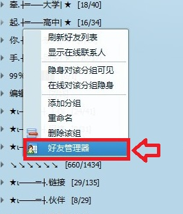 一、首先登录QQ,然后QQ面板的好友分组界面的空白处,单机鼠标右键,然后选择打开“好友管理器”即可,如下图所示: