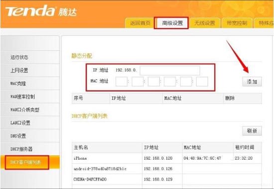 10、如果根本没有数据包收到,则表明路由器端在采用静态IP绑定时,将该计算机的IP地址没有登记在内。解决办法:在“高级设置”选项卡“DHCP客户端”界面,增加本机的IP和MAC地址对。如图所示: