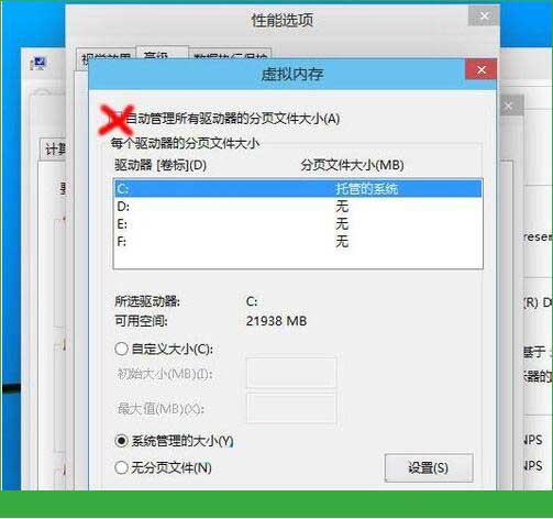7、系统默认为全局自动分配,取消选项“自动管理所有驱动器的分页文件大小”。如图所示:
