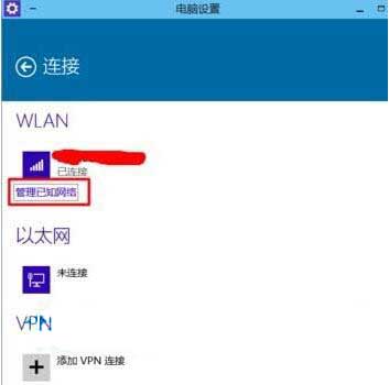 2、在随后出现的电脑设置“连接”窗口,点击“管理已知网络”。如图所示: