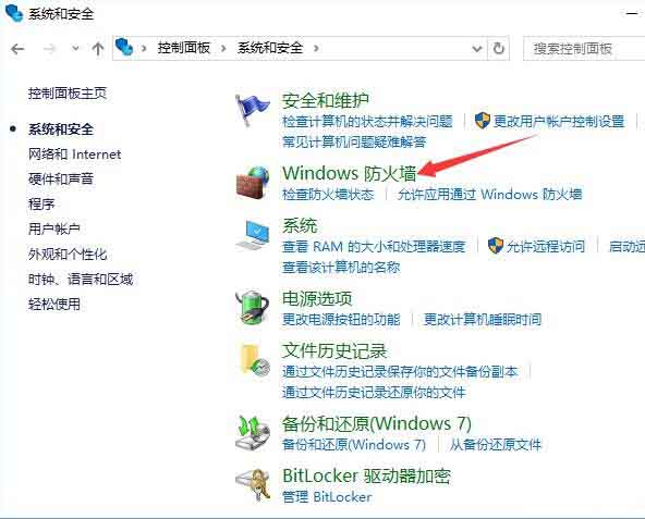 2、选择“Windows防火墙”,然后“高级设置”;