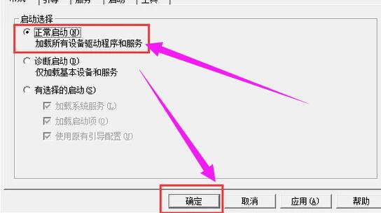 3、接着选取“正常启动”,再点击“确定”按钮;如图所示: