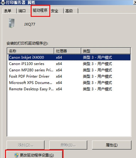 2、单击”打印服务器属性”—”驱动程序”,单击下方”更改驱动程序设置”;如图所示: