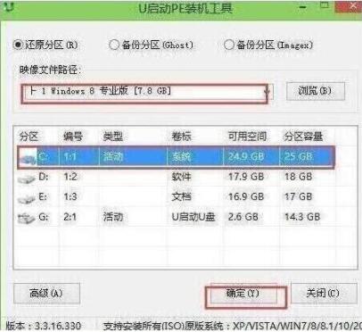 2、在u启动pe装机工具中,将win8系统镜像安装在c盘中并点击确定按钮,如图: