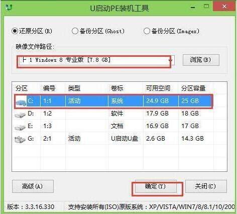 2、在u启动pe装机工具中,将win8系统镜像安装在c盘中并点击确定按钮,如图: