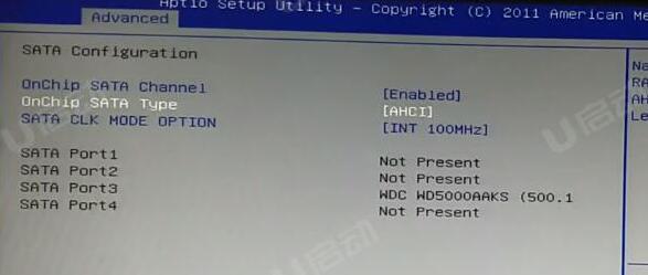 2.选择Advanced,选择SATA Configuration,OnChip SATA Type选择AHCI。如图所示: