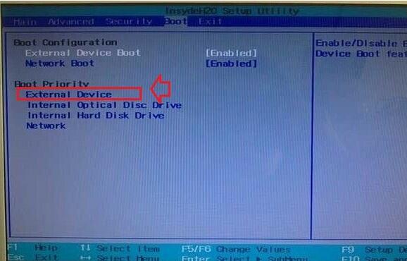 1、开机快速连续按F2热键进入bios设置界面,切换到Boot选项,使用方向键↓选中“External Device Boot”后回车,设置为Enabled后回车,如图:
