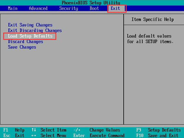 2、按→键到exit选项,然后找到load setup defaults选项,并将光标移至该选项按回车,如图: