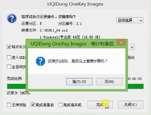 3、弹出程序将执行还原操作窗口,勾选“完成后重启”复选框,点击确定即可,如图: