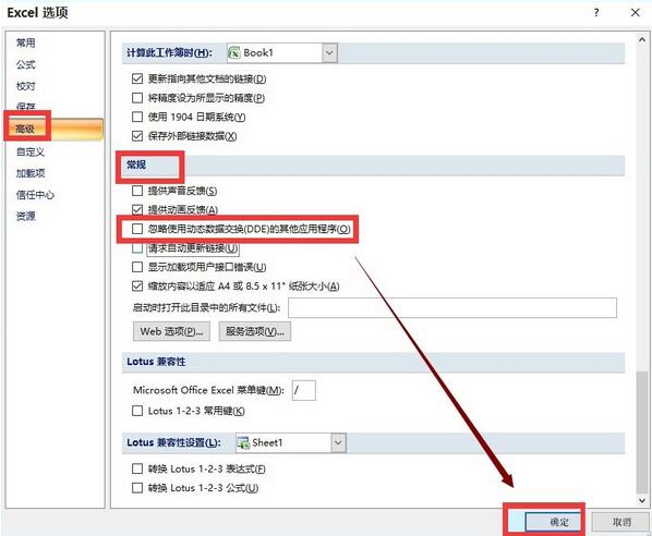 6、在高级选项右侧列表中下拉,找到常规,把“忽略使用动态数据交换(DDE)的其它应用程序”前面的勾去掉,然后点击“确定”按钮,重新启动Excel程序即可!如下图所示: