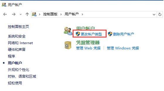 1、打开控制面板-用户帐户,点击“更改帐户类型”。如图所示: