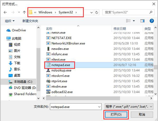 3、如是64位系统,打开C:Windows\SysWOW64文件夹,32位系统打开C:Windows\system32,找到并选中“notepad.exe”,点击打开,之后就可以打开TXT文本文档了。如图所示: