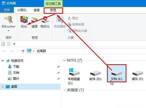 1、打开“此电脑”,选中任意磁盘盘符,然后点击“管理”—“优化”;如图所示: