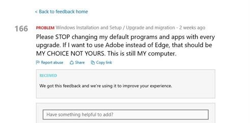 “求你们不要每次升级都更改我的默认程序和应用了。如果我想使用Adobe而不是Edge,那是我的选择,而不是你们的。这怎么说也是我的电脑。”