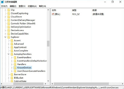 2、定位到:计算机\HKEY_CURRENT_USER\Software\Microsoft\Windows\CurrentVersion\Explorer\AutoplayHandlers\KnownDevices\,如图所示:
