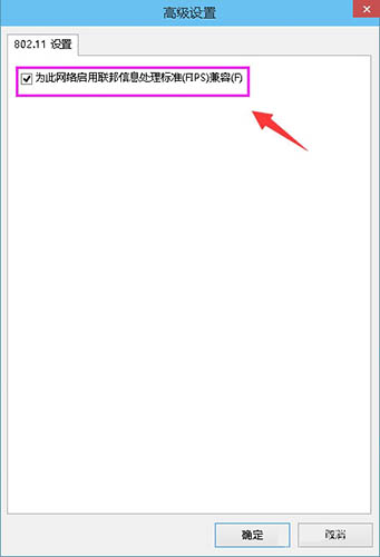 5、勾选【为此网络启用联邦信息处理标准(FIPS)兼容】这一项,然后确定,断开笔记本电脑WIFI网络,再重新开启应该就能正常连接了。如图所示: