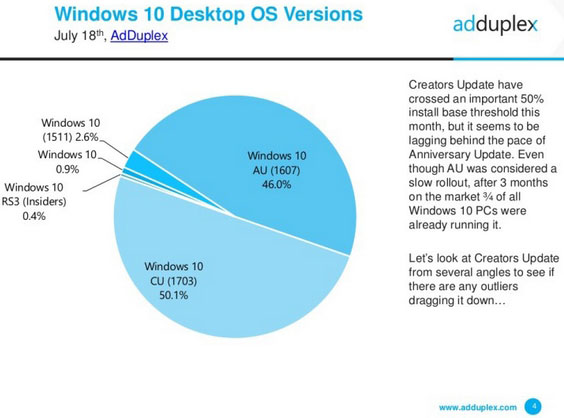 据媒体报道,数据统计机构adduplex近日发布了windows最新报告,在7月份win10创意者更新系统在整个windows10系统当中份额已经增长到了50.1%,成为了最流行的win10系统,而在六月底,win10创意者更新系统占比份额还只有35.7%。