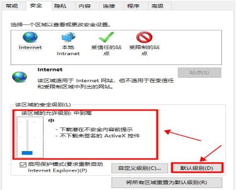 5、再次回到上一个页面,点击“默认级别”,将左侧该区域的安全级别调低,点击“确定”即可。如图所示: