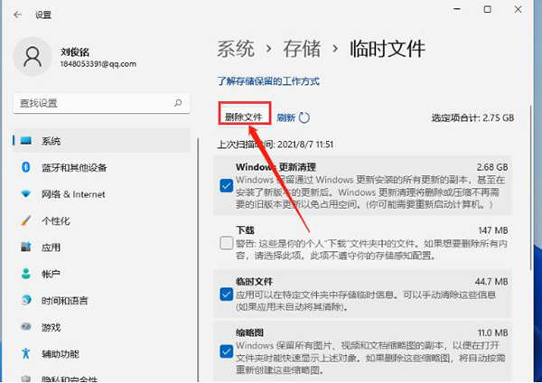 4、系统 - 存储 - 临时文件下,可以看到列出来的文件和各自占用的空间;如图所示: