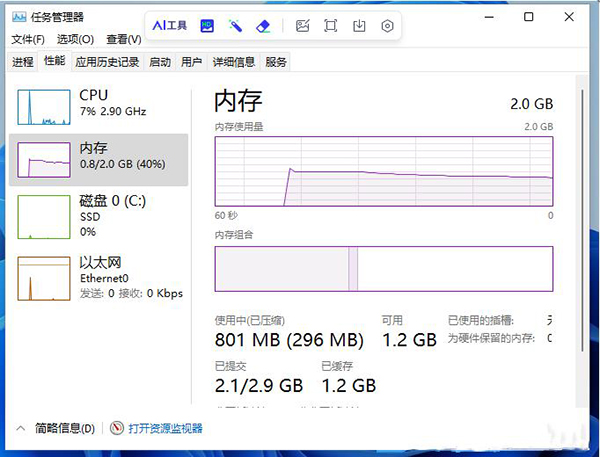 2、任务管理器窗口,切换到【性能】选项卡,然后点击底部的【打开资源监视器】;如图所示: