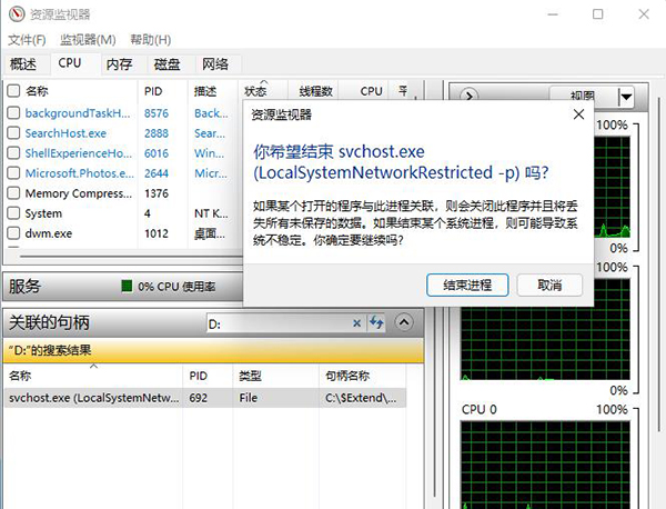 5、弹出的资源监视器窗口,直接点击【结束进程】,与U盘相关的进程结束后,U盘就可以安全弹出了。如图所示: