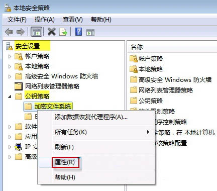 2、 “安全设置》公钥策略》加密文件系统”项。右击“加密文件系统”,选择“属性”。如图所示: